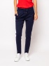 Dámske športovo-elegantné teplákové nohavice štandardného strihu, s dvomi bočnými vreckami a šnúrou v páse, vzadu dve falošné vrecká. Materiál: 63 % viskóza, 32% nylon, 5% elastan.