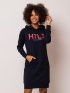 Športové dámske šaty s kapucňou, s dlhým rukávom, s rebrovanými manžetami a spodným dielom, s veľkým logom v predu, a klokanským vreckom a s dĺžkou po kolená. Materiál: 58% bavlna, 38% polyester, 4% elastan, french terry. Modelka je vysoká 175 cm a má na sebe veľkosť M.Menej informácií
