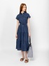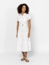 Dámske plátené šaty s dĺžkou po členky, nariasenou sukňou a zapínaním na gombíky. Nastaviteľný pás s opaskom, krátke rukávy, spadnuté ramená a predné našité vrecko s chlopňou. Mate