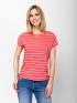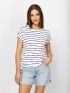 Dámske tričko s krátkym rukávom, voľným strihom, okrúhlym výstrihom a spustenými ramenami. Vyrobené z pruhovanej látky s bočným švom na šnúrku a malým logom značky na chrbte. Mater