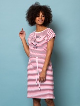 Prúžkované dámske šaty s okrúhlym výstrihom, s krátkymi spadnutými rukávmi, s dĺžkou po kolená a so šnúrkou na zaväzovanie. Materiál: 100% bavlna, single jersey. Modelka je 175 cm vysoká a má na sebe veľkosť M.