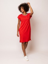 Dámske šaty so spadnutými rukávmi, s okrúhlym pruhovaným výstrihom a s dĺžkou po kolená. Materiál: 55% bavlna, 45% modal, single jersey. Modelka je vysoká 175 cm a má na sebe veľkosť M.